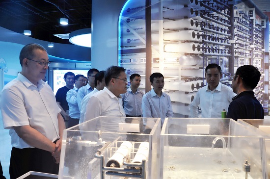 圖片:碧水源董事長文劍平(右一)向辛國斌副部長(右二)匯報我國膜技術(shù)市場的發(fā)展情況,